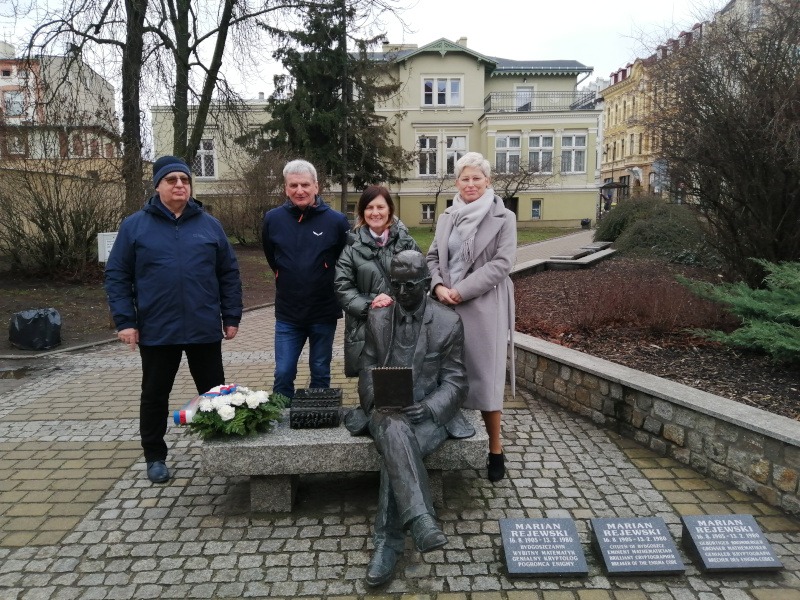 Uczestnicy wycieczki przy Ławeczce Mariana Rejewskiego.
